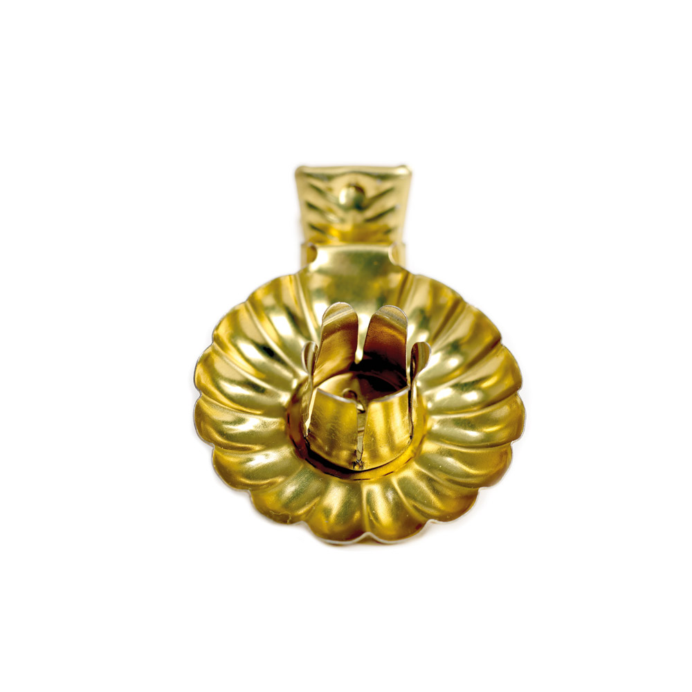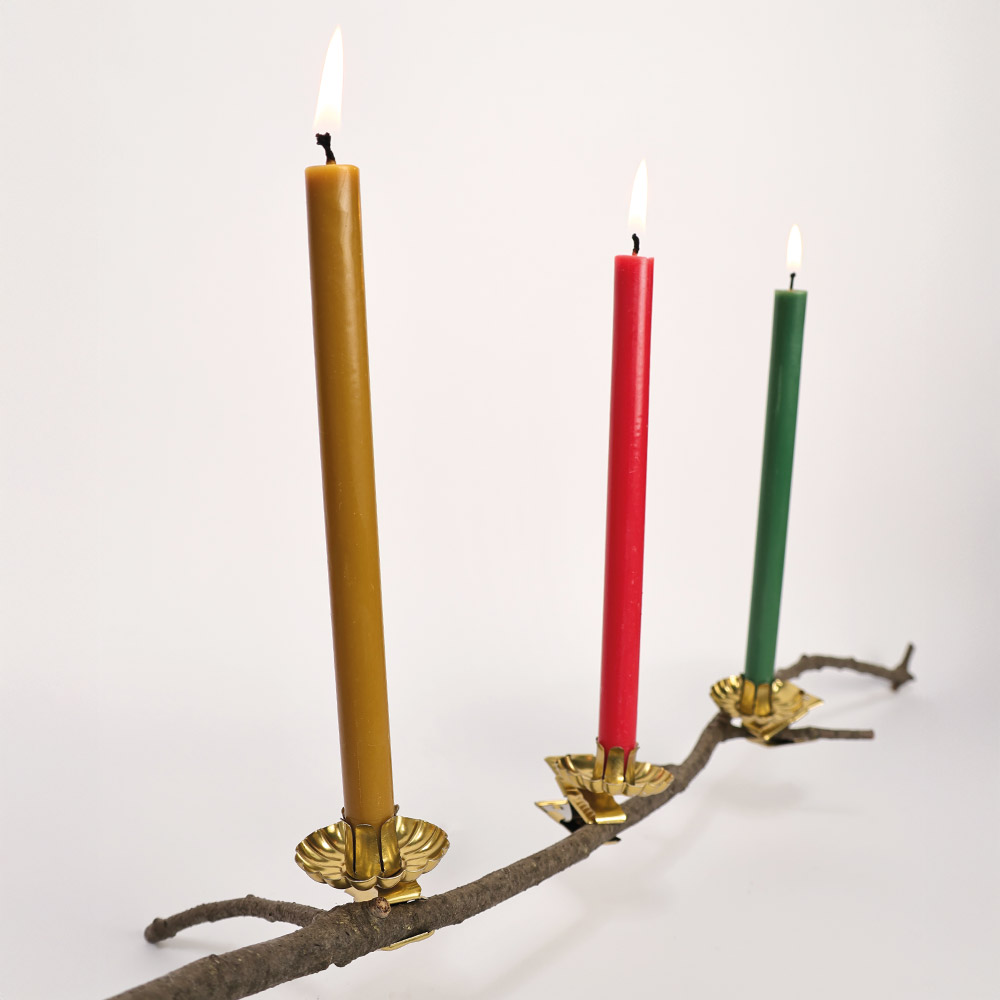 Durch leichtes Zusammendrücken oder Öffnen der Halterstäbchen könnt ihr Kerzen mit 10–15 mm Durchmesser festklemmen. Ein kleiner, runder Teller fängt das Wachs auf, wenn die Kerze tropft.