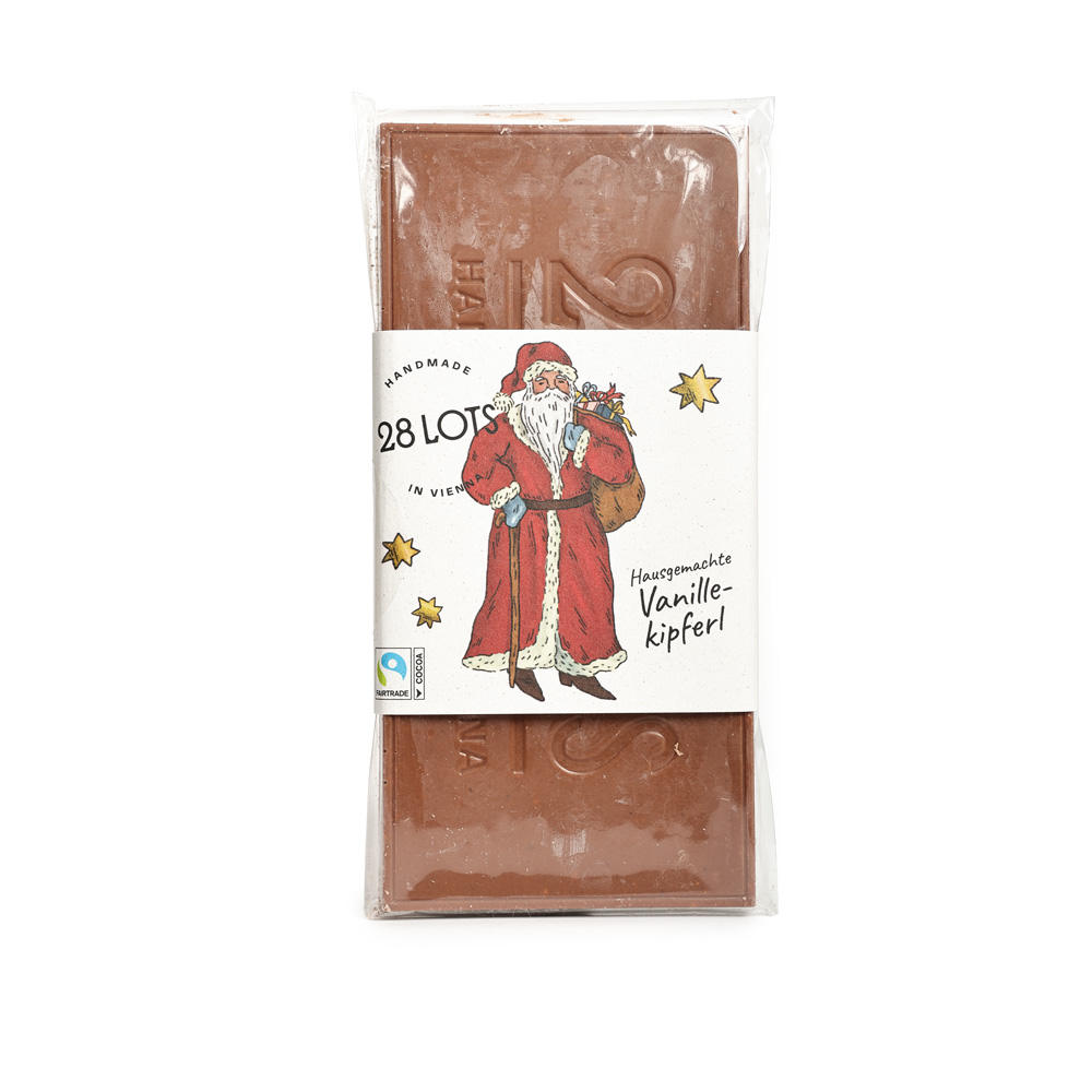 In Wien handgeschöpfte Vollmilchschokolade mit hausgemachten Vanillekipferln (17%) und Kakao: 33% mindestens.
