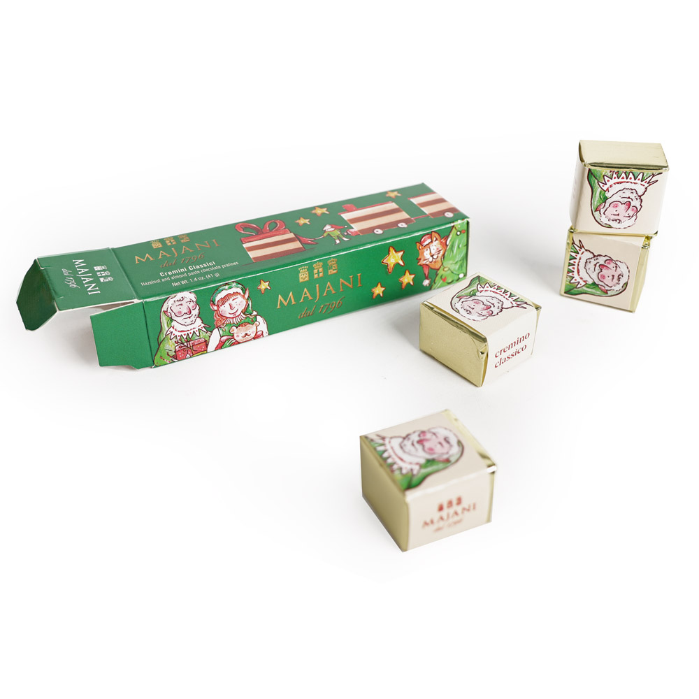 Zart, cremig und köstlich. Die klassischen Cremini verbinden Haselnuss- und Mandelcreme in vier feinen Schichten. Verpackt in einer liebevoll gestalteten Weihnachtsedition – perfekt zum Verschenken oder selbst Genießen. Zum Glück gibt es in jeder Schachtel gleich 4 davon.