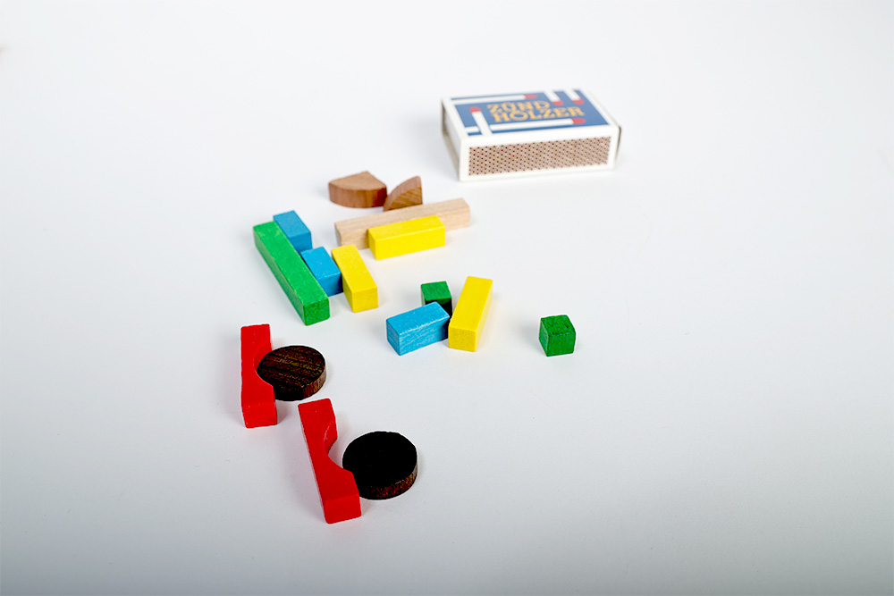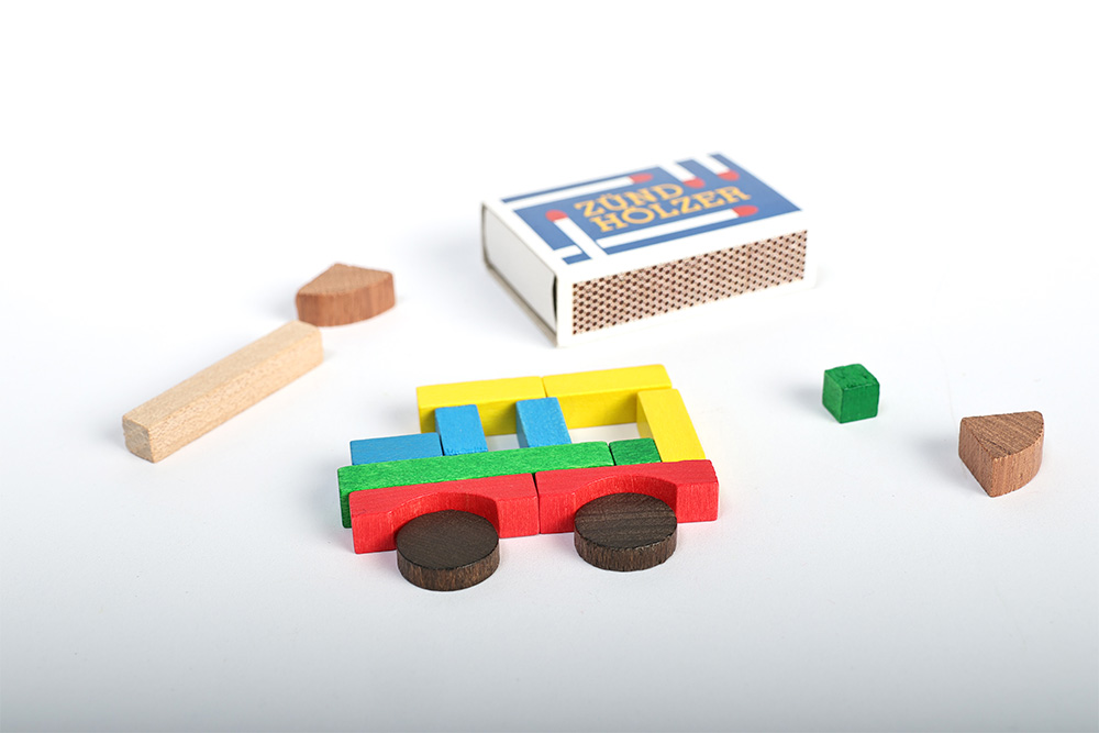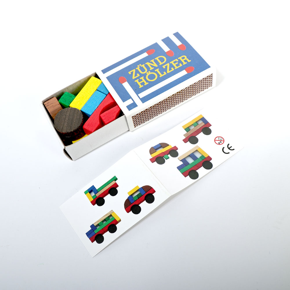 6 unterschiedliche Autos lassen sich aus den kleinen, farbigen Holzelementen puzzeln. Wird das Auto mal nicht gebraucht, wird es in der kleinen Streichholzschachtel bis zum nächsten Einsatz sicher verwahrt.