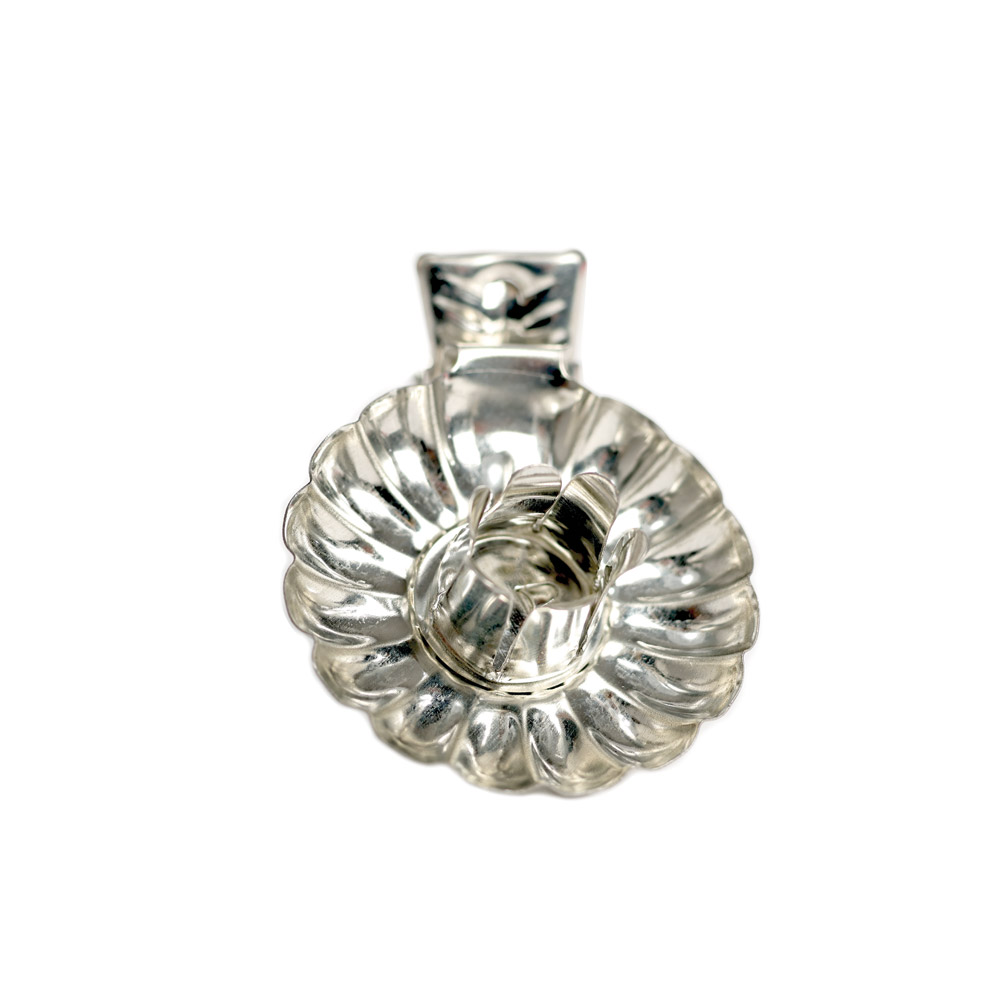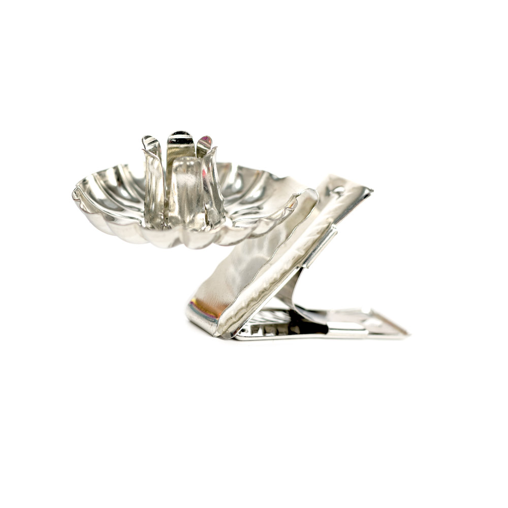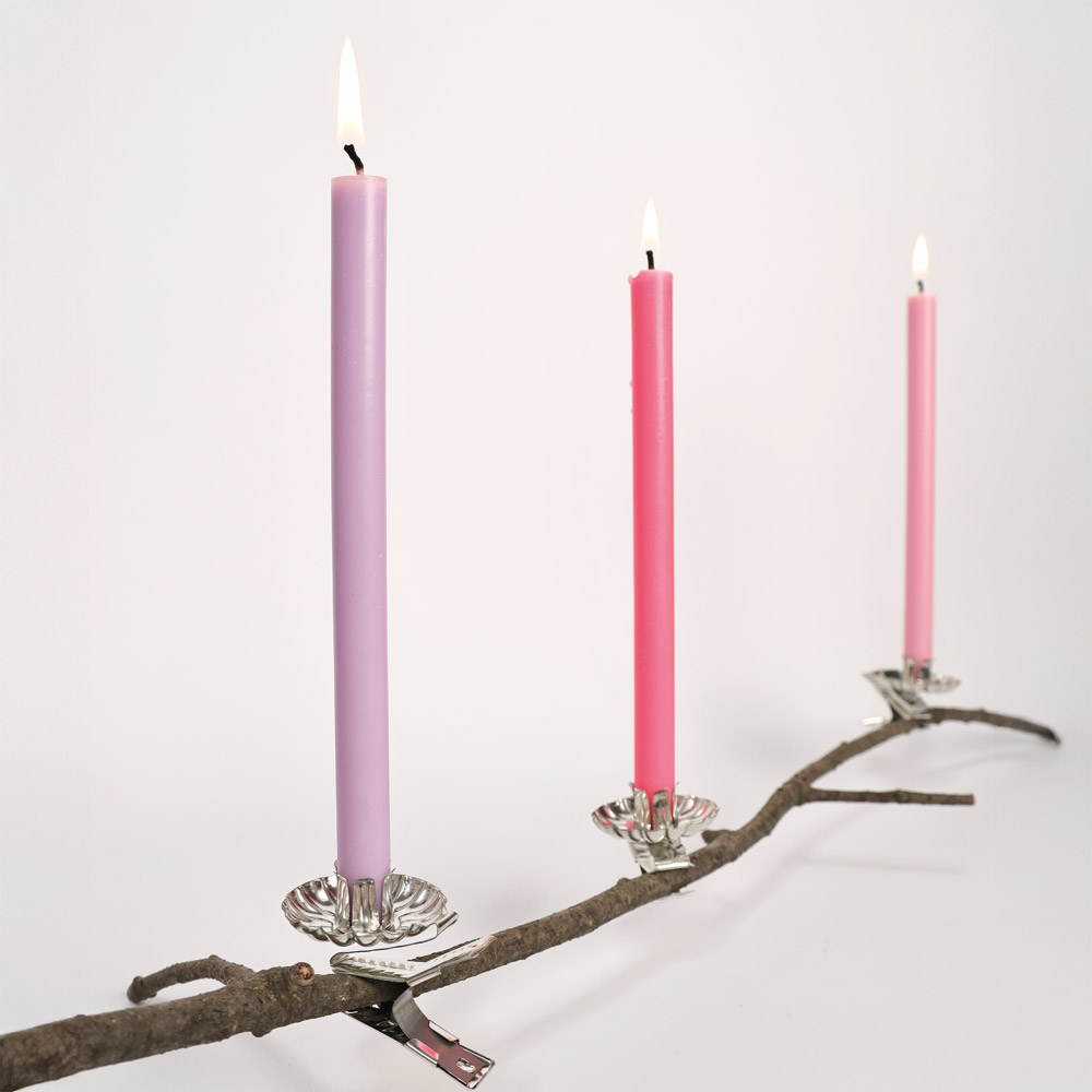 Durch leichtes Zusammendrücken oder Öffnen der Halterstäbchen könnt ihr Kerzen mit 10–15 mm Durchmesser festklemmen. Ein kleiner, runder Teller fängt das Wachs auf, wenn die Kerze tropft.