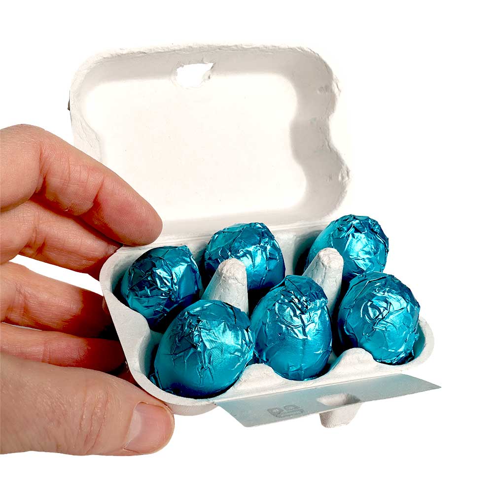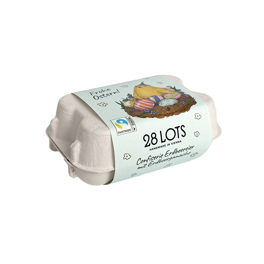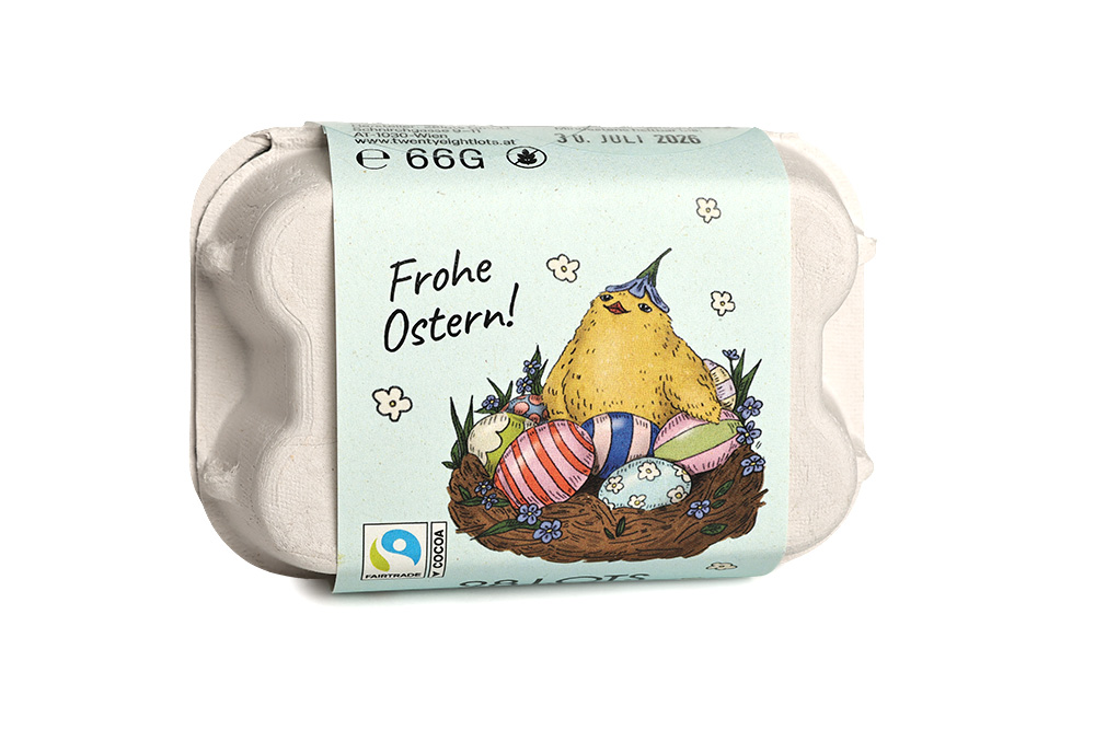 6 kleine, köstliche Schokoeier im klassischem Mini-Eierkarton aus der Wiener Schokoladenmanufaktur 28 Lots. Eine tolle Aufmerksamkeit für euer Osternest.