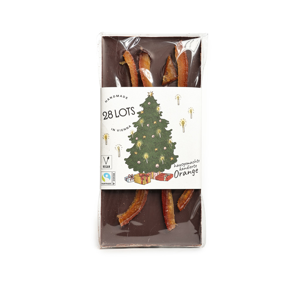 In Wien handgeschöpfte dunkle Schokolade mit hausgemachter kandierter Orange (17%) und Kakao: 54% mindestens. VEGAN.