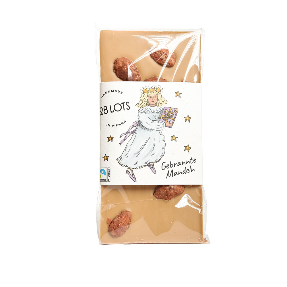 In Wien handgeschöpfte Karamellschokolade mit gebrannten Mandeln (17%) und Kakao: 30% mindestens. ZUTATEN: Kakaobutter, Zucker, Mandeln (Zucker, Glukose, Sonnen-blumenöl, Emulgator: Gummi Arabicum, Sonnenblumenlecithin, Honig), Vollmilchpulver, Milchzucker, Molkenpulver (Milch), Magermilchpulver, karamellisierter Zucker 2,0%, Emulgator: Sojalecithin, natürliches Vanille Aroma, Salz. Glutenfrei. Palmölfrei. Kann Spuren von Schalenfrüchten enthalten. Dunkel, trocken und vor Wärme schützend lagern.