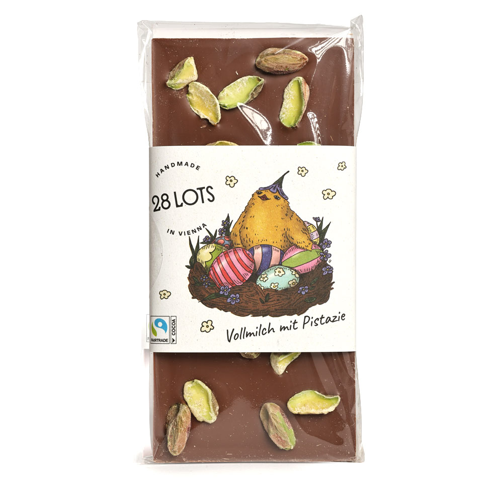 In Wien handgeschöpfte Vollmilchschokolade mit kalifornischen Pistazien (15%) und Kakao: 33% mindestens.