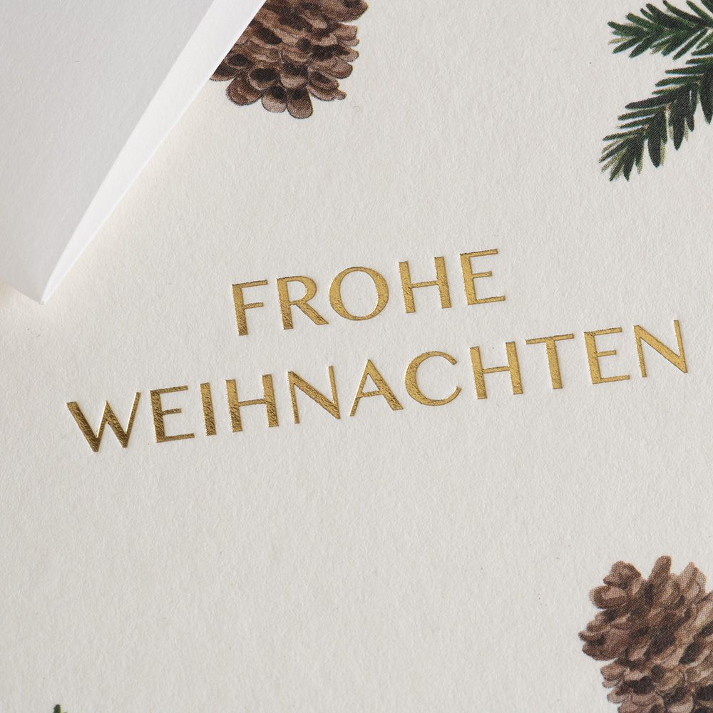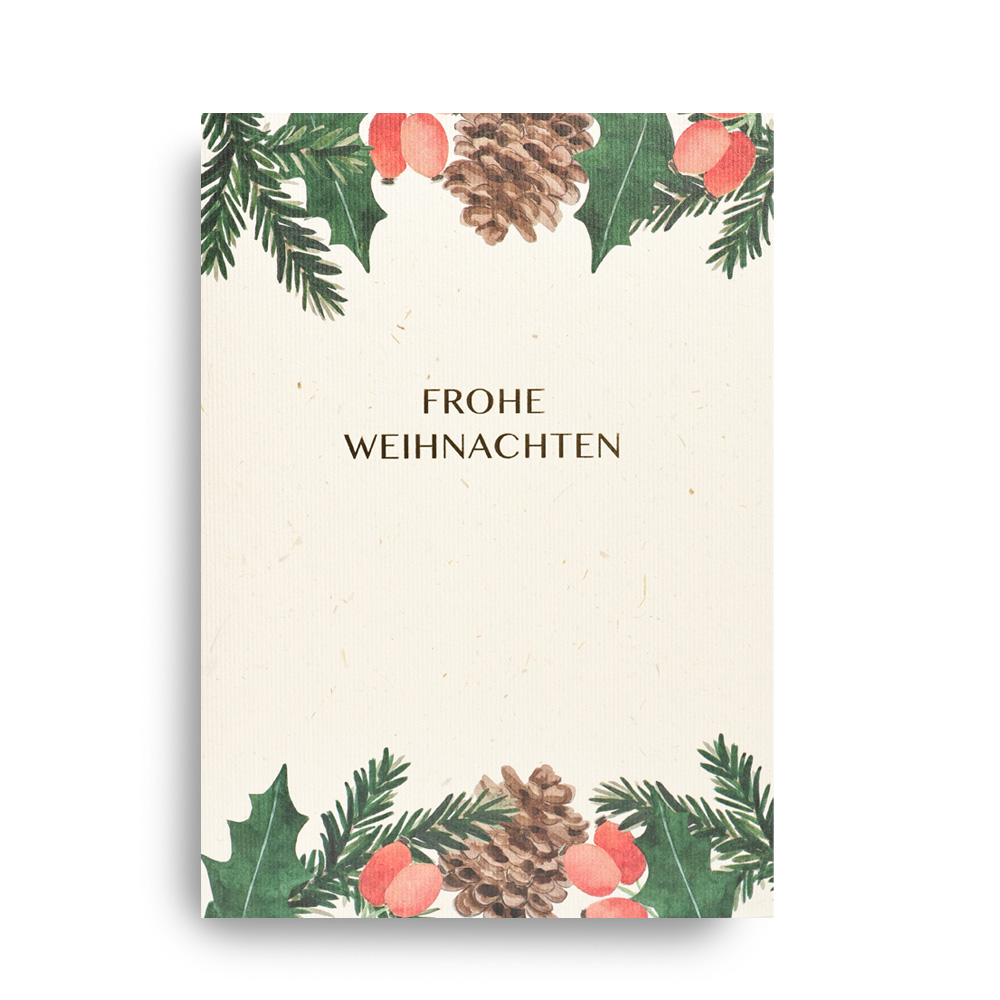Papiere von Gmund lassen die Herzen aller Papierliebhaber*innen höher schlagen. Geschriebene Worte sind auf diesem Hanfpapier gut aufgehoben. Das Gmund Hanfpapier bekommt seinen unverwechselbaren Charakter durch die Zugabe von 100% europäischen Hanffasern. Eine ökologische und kreative Papiersensation. Die Klappkarte ist farbig bedruckt und mit goldener Heißfolie veredelt – eine schöne und zugleich nachhaltige Grußkarte zum Weihnachtsfest.