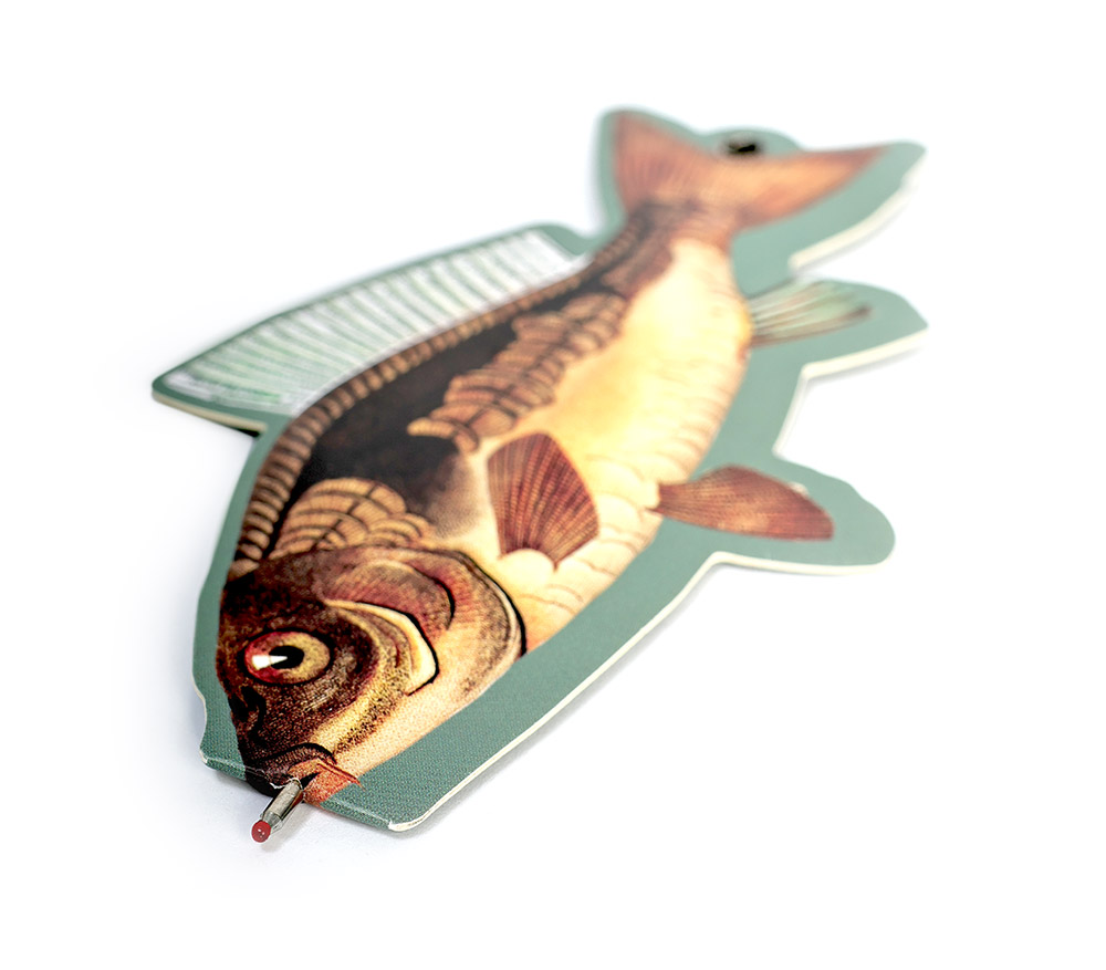 Praktischerweise ist dieser Fisch gleich beides. Als Papierkugelschreiber ist er stabil genug, um damit zu schreiben, als Lesezeichen genutzt ist er so flach, dass der Fisch zwischen zwei Seiten eines Buchs gelegt werden kann. Heraus schaut dann nur ein Stück seiner Flosse.