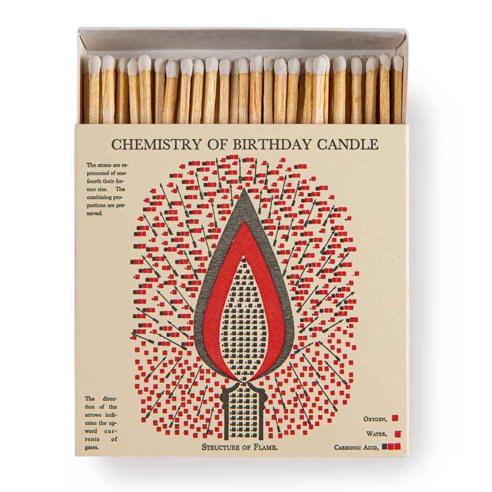Auf den Luxury Matches ist sehr viel Platz: überdimensioniert große Schachteln mit langen Streichölzern. Im Letterpress-Farbdruck werden die Illustrationen aus England auf die Schachteln gebracht. Wie schön!