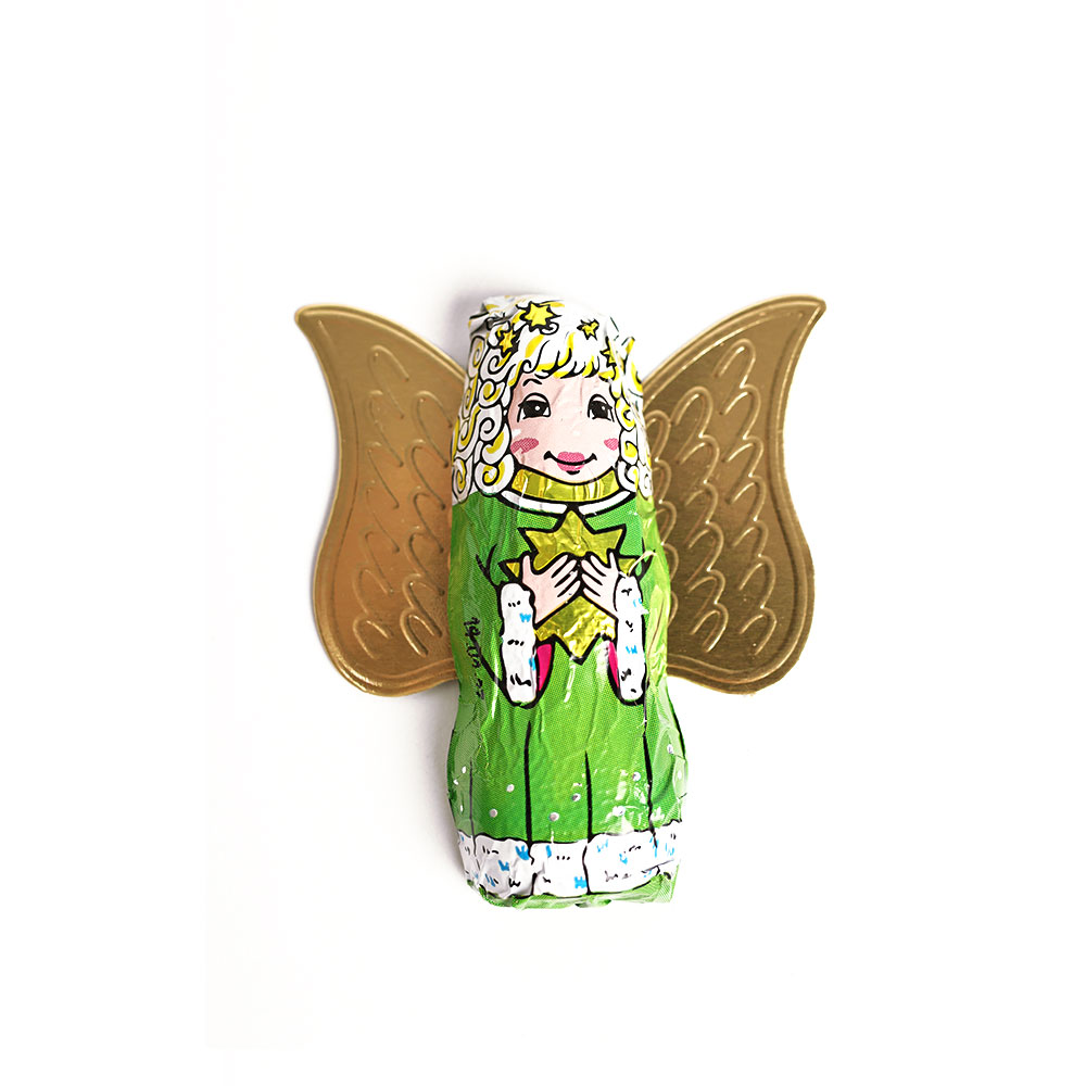 Ein Engel aus feinster Vollmilchschokolade auf goldenen Kartonflügeln – perfekt für den Adventskalender oder als kleine Aufmerksamkeit zum Geschenk.