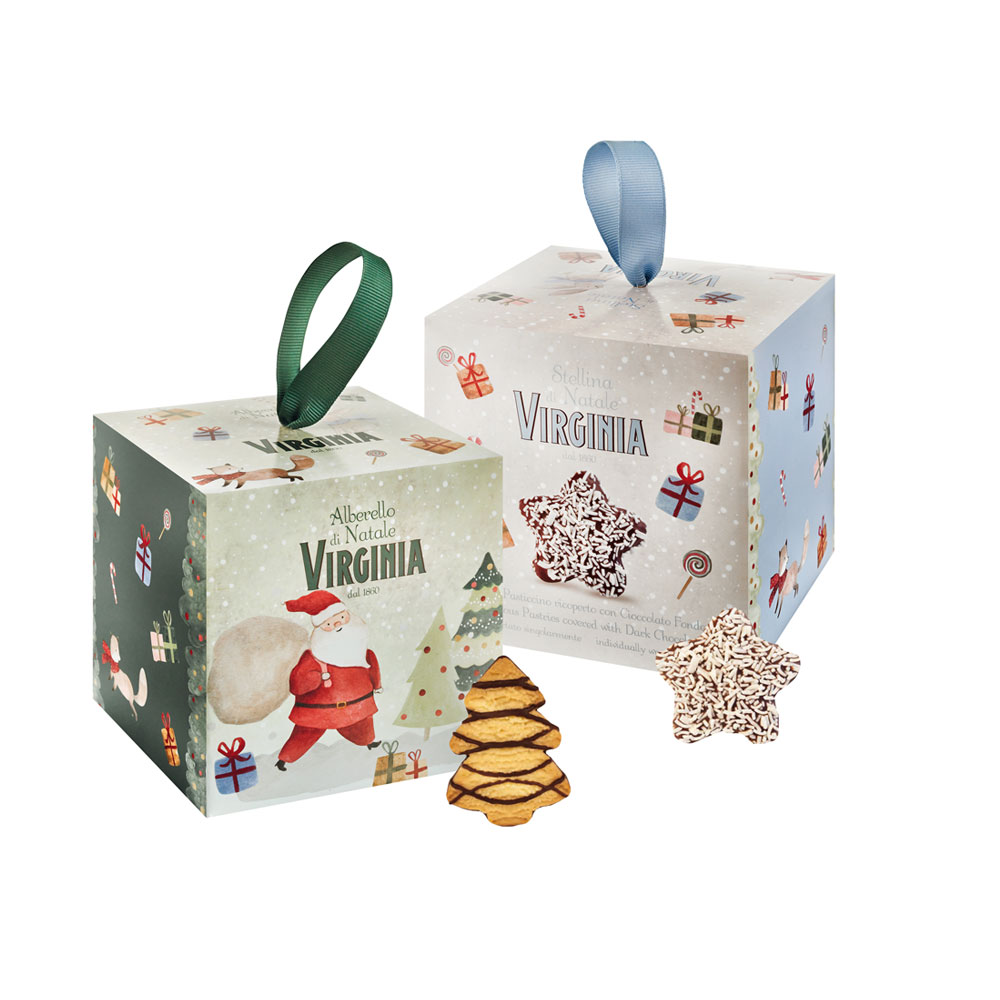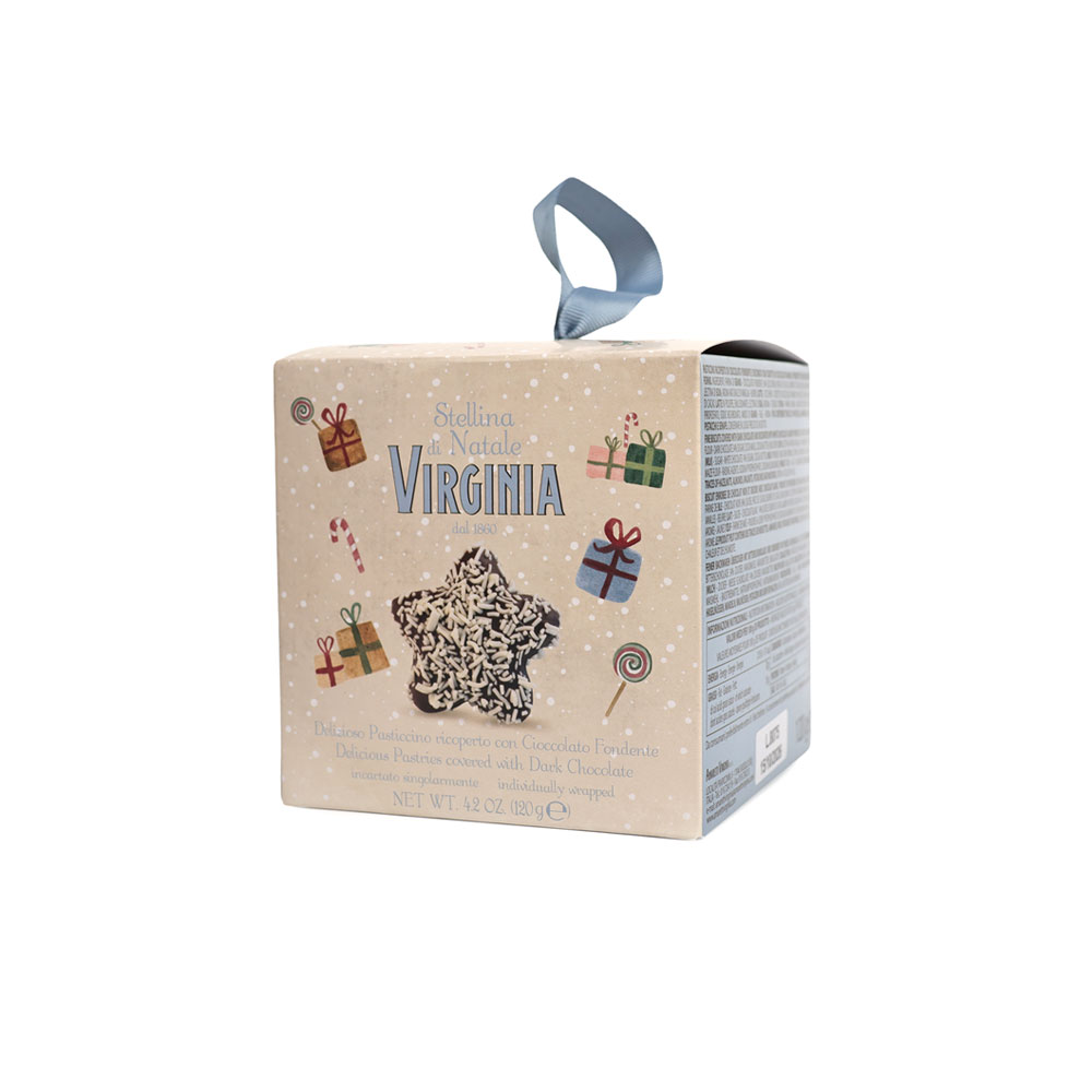 Freut euch auf köstliche Weihnachtscookies in einer liebevoll illustrierter Kartonbox mit Aufhängekordel. Dieses traditionelle italienische Gebäck ist ein perfektes Geschenk zur Weihnachtszeit. Die Kekse in Sternenform sind mit zartschmelzender dunkler Schokolade überzogen und mit weißen Schokostreuseln verziert. Gewicht: ca. 120g